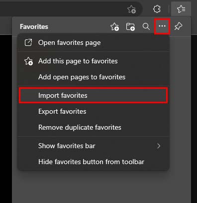 Abra a guia favoritos pressionando Ctrl + Shift + O tecla de atalho. Clique no ícone de reticências e selecione Importar favoritos.