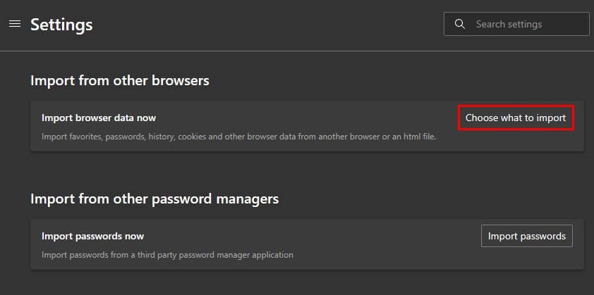 Além de Importar dados do navegador agora, clique em Escolher o que importar.