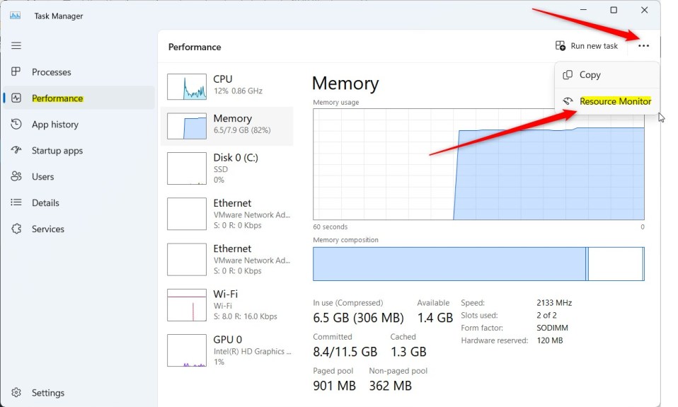 Em seguida, selecione a página Desempenho no menu à esquerda. Em seguida, selecione a opção de elipse (três pontos) no canto superior direito e escolha Monitor de recursos no menu suspenso.