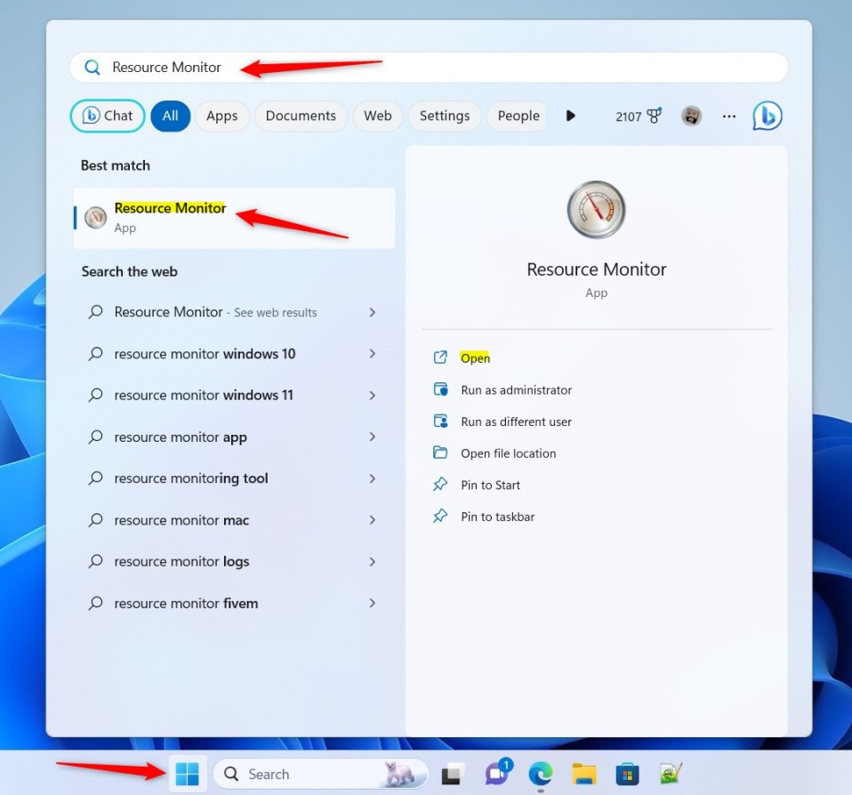 A maneira mais rápida de abrir o Monitor de recursos no Windows é usar a caixa de pesquisa do menu Iniciar.