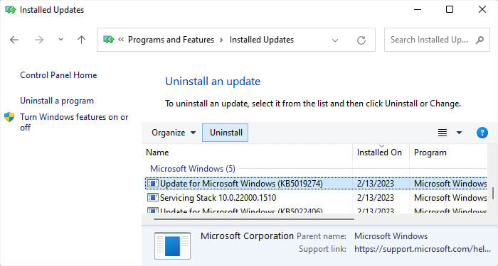 Abra Executar. Digite appwiz.cpl e clique em OK para abrir Programas e recursos. Vá para Exibir atualizações instaladas e role para baixo até a categoria Microsoft Windows.