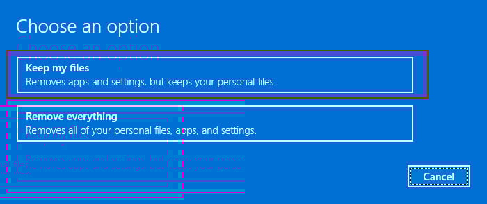 Verifique se o dispositivo está conectado à Internet e abra Executar. Digite systemreset-factoryreset e pressione Enter para executar o recurso Redefinir. Selecione Manter meus arquivos e, em seguida, Baixar na nuvem.