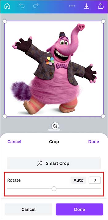 Se você precisar girar sua imagem de cabeça para baixo, há duas maneiras para ir sobre isso. Arraste a alça de rotação manualmente até virar a foto ou siga estas etapas: