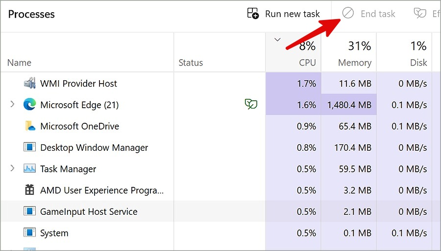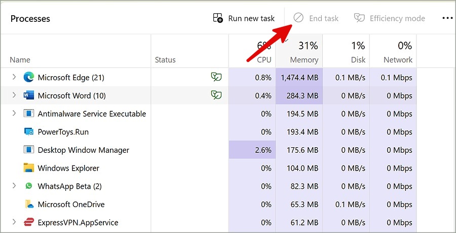 3. Selecione um aplicativo com alto uso de memória e clique em Finalizar tarefa na parte superior-Esquina direita.