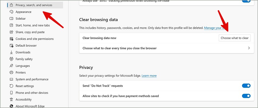 2. Selecione Privacidade, pesquisa e serviços na barra lateral e selecione Limpar dados de navegação.