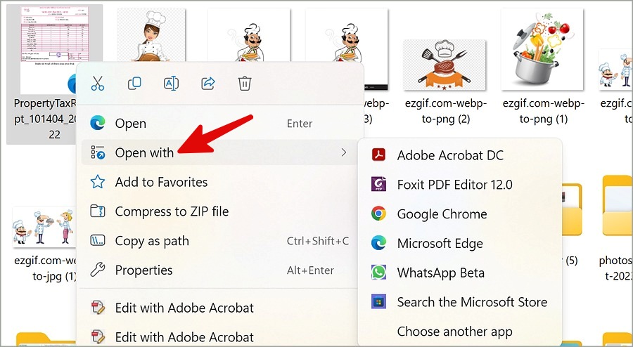 2. Clique com o botão direito em um arquivo PDF e expanda Abrir com. Selecione um leitor de PDF de terceiros.