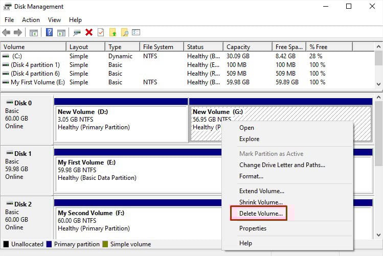 Clique com o botão direito do mouse na partição e escolha Excluir volume.
