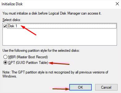 Depois de iniciar o utilitário Gerenciamento de disco, a opção Inicializar disco caixa de diálogo também deve abrir com ele. Dependendo do número de novos discos rígidos instalados, selecione-os nos discos listados. Na seção de estilo de partição, escolha MBR ou GPT. Se você é novo neste tópico, aqui está um guia completo que deve ajudá-lo a diferenciá-los. Resumindo, escolha MBR se estiver usando um sistema legado. Caso contrário, o GPT deve ser a escolha ideal. Pressione o botão Ok para concluir a inicialização do disco.