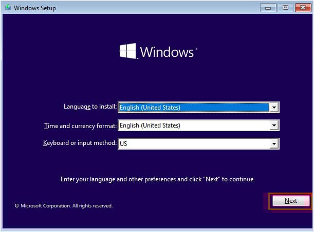 Inicialize seu computador usando a unidade flash USB inicializável. Quando estiver na tela de configuração do Windows, confirme sua entrada de teclado e configurações relacionadas antes de pressionar Avançar.