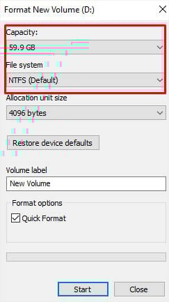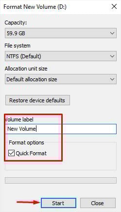 Além disso, edite o Rótulo do volume de acordo com sua escolha ou ignore-o. Selecione/desmarque Formatação rápida com base em sua preferência nas opções de formato. Depois que todos os campos estiverem configurados, pressione o botão Iniciar .