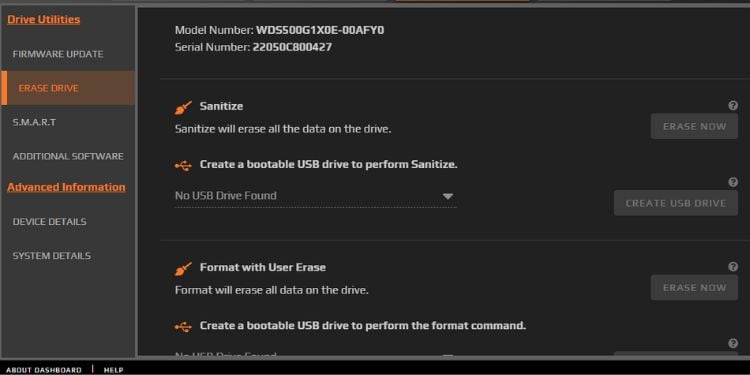 Por exemplo, o aplicativo Dashboard da Western Digital tem os recursos Sanitize e Format with Erase que funcionam de maneira diferente. Da mesma forma, os usuários da Samsung podem optar pelo software Magician e os usuários da HP podem optar pela ferramenta USB Disk Storage Format.