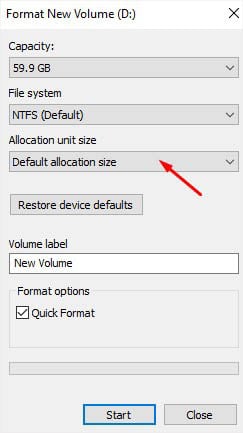 Em seguida, mantenha o tamanho da unidade de alocação no tamanho de alocação padrão. Você pode pressionar o botão Restaurar padrões do dispositivo. No entanto, você pode definir o tamanho desejado (maior se estiver trabalhando em arquivos grandes e menor para arquivos menores).
