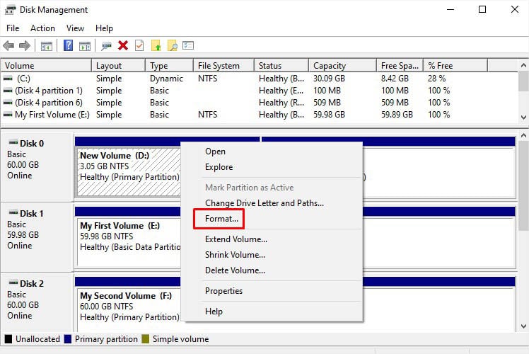 Ao contrário do File Explorer, o Disk Management permite formatar as partições e os discos rígidos. No entanto, para o último, você precisa excluir todas as partições e criar uma partição primária primeiro.