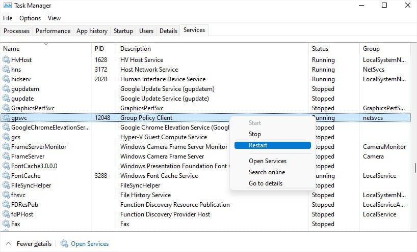 Alterne para a guia Serviços e localize gpsvc. Clique com o botão direito do mouse e escolha Reiniciar.