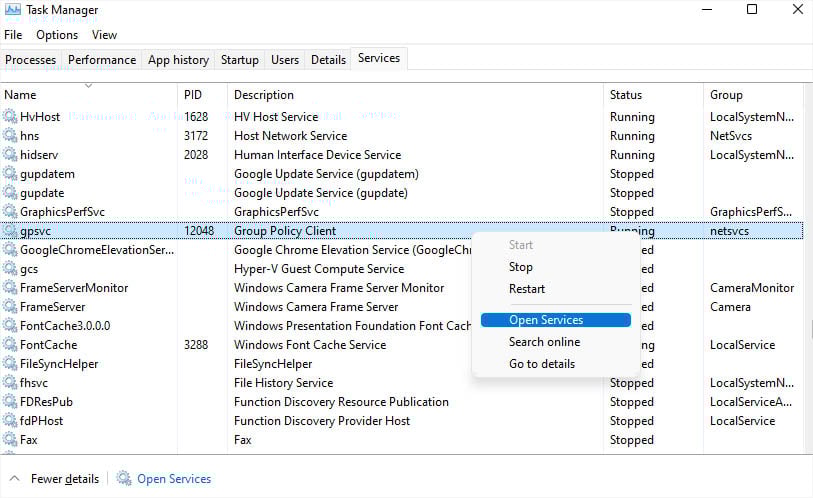 Vamos começar verificando os problemas relacionados ao serviço. Por padrão, o processo do serviço GPSVC está sempre em execução em segundo plano. Essa é a razão pela qual a maioria das opções está acinzentada.