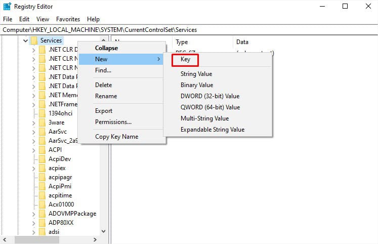 Computer\HKEY_LOCAL_MACHINE\SYSTEM\CurrentControlSet\Services\ Clique com o botão direito do mouse em qualquer lugar no painel esquerdo (com a pasta Services selecionada) e escolha New > Chave.
