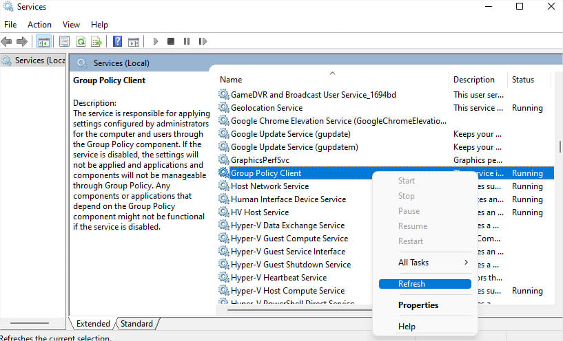 Depois de acessar o utilitário Serviços, localize Group Policy Client. Clique com o botão direito neste serviço e selecione Atualizar.