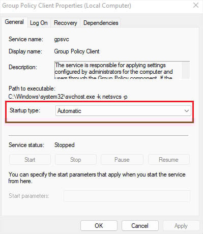 O serviço GPSVC (Group Policy Client) aplica a política de grupo relacionada configurações (configuradas pelo administrador) para todos os usuários desse computador. Não é um serviço básico do Windows, mas geralmente é executado como um processo em segundo plano e durante a inicialização para monitorar as configurações de política de grupo.