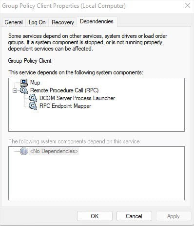 O serviço Cliente de Diretiva de Grupo depende da Chamada de Procedimento Remoto (RPC), Iniciador de Processo do Servidor DCOM e Mapeador de Ponto de Extremidade RPC. Para verificar isso, você pode alternar para a guia Dependências .