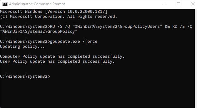Na CLI, execute o seguinte código para redefinir todas as configurações da Diretiva de Grupo Local: