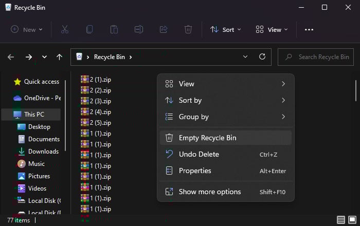 Abra Executar. Digite shell:recyclebinfolder e pressione Enter para abrir a Lixeira. Você também pode clicar duas vezes no ícone da Lixeira em sua área de trabalho. Clique com o botão direito em todos os arquivos desnecessários que você não precisa e selecione Excluir > Sim. Se você não precisar de nenhum item dentro desta pasta Shell, clique com o botão direito do mouse em uma área vazia e selecione Esvaziar Lixeira > Sim.