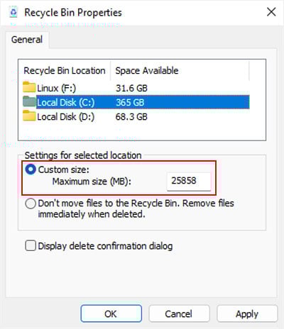 Você também pode diminuir a Lixeira máxima para suas unidades para limitar a reserva de espaço maior no futuro.