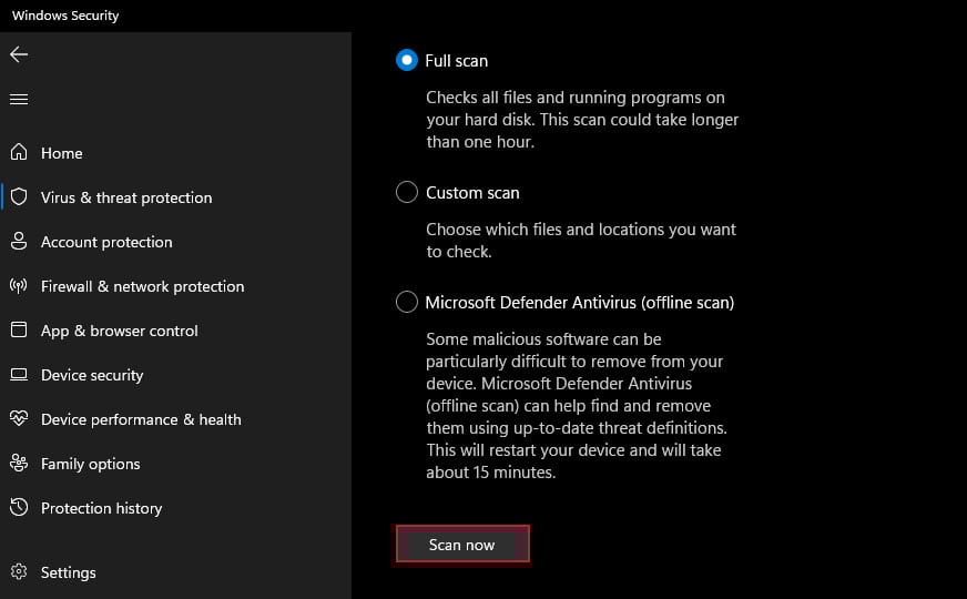 Abra Executar. Digite ms-settings:windowsdefender e pressione Enter para abrir a Segurança do Windows. Clique em Proteção contra vírus e ameaças e depois em Opções de verificação. Verifique a Verificação completa e clique em Verificar agora.