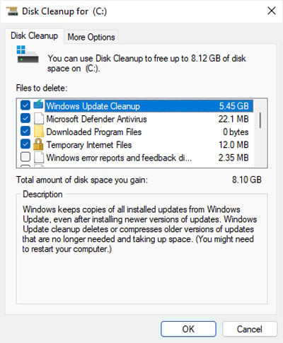 Selecione a unidade novamente e clique em OK. Selecione todas as opções desnecessárias, incluindo Limpeza do Windows Update, Instalação anterior do Windows e Arquivos de instalação temporária do Windows (se disponível).
