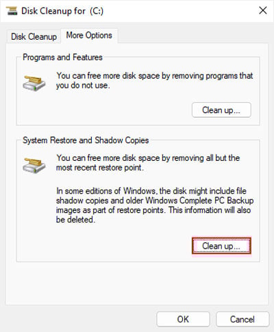 Abra Executar. Digite cleanmgr e pressione Enter para abrir o assistente de limpeza de disco. Selecione a unidade C e pressione Enter. Clique em Limpar arquivos do sistema. Selecione a unidade novamente e clique em OK. Vá para a guia Mais opções . Clique em Limpar em Restauração do sistema e cópias de sombra.