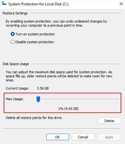 Abra Executar Digite systempropertiesprotection e pressione Enter para abrir a Proteção do sistema guia de Propriedades do sistema. Selecione uma unidade em que a proteção esteja ativada e clique em Configurar. Altere o Uso máximo para um valor menor movendo o controle deslizante e clique em OK.