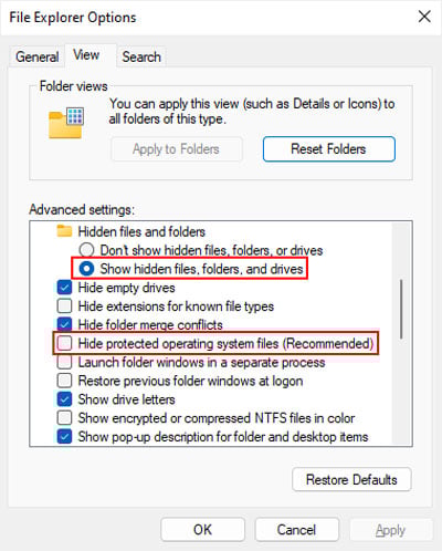 Abra Executar pressionando a tecla Windows + R. Digite control folders e pressione Enter para abrir File Explorer Opções. Vá para a guia Exibir . Marque Mostrar arquivos, pastas e unidades ocultas e desmarque Ocultar arquivos protegidos do sistema operacional.
