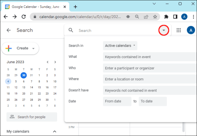 Para encontrar um determinado evento, clique na seta para baixo à direita da caixa de pesquisa. Isso abrirá a Pesquisa avançada do Google Agenda. Você pode então selecionar os calendários para pesquisar.