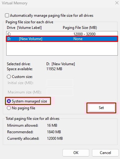 Agora, clique no volume no qual você deseja definir pagefile.sys. Marque Tamanho gerenciado pelo sistema e clique em Definir.