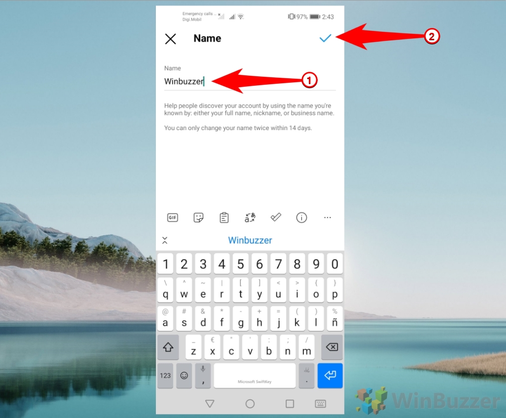 Toque no símbolo de gancho novamente para salvar o nome/nome de usuário do Instagram alterado