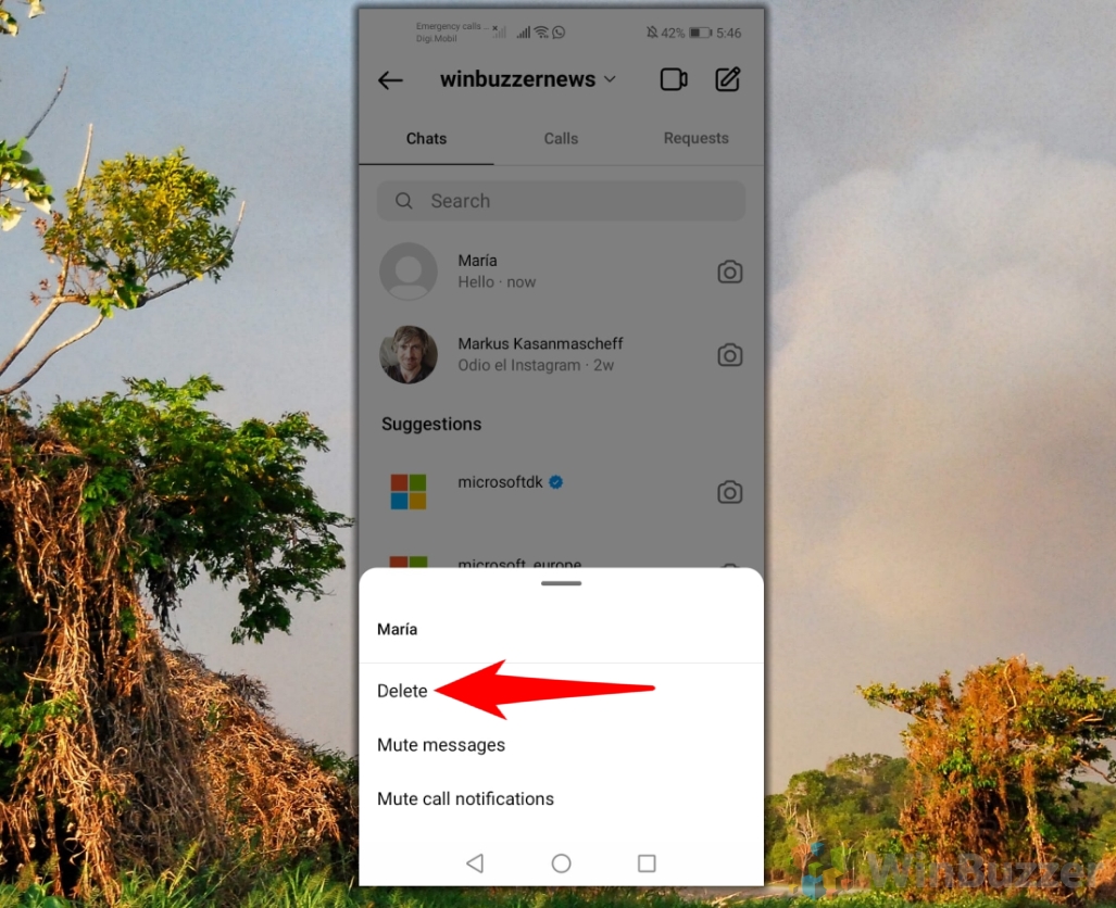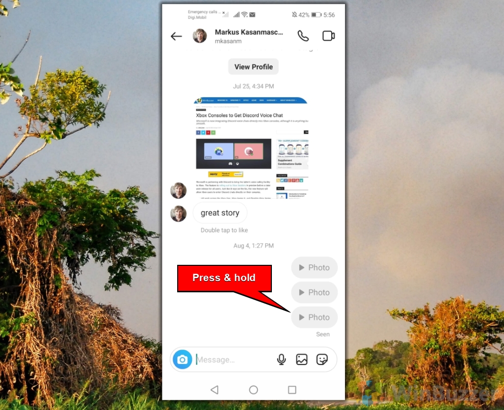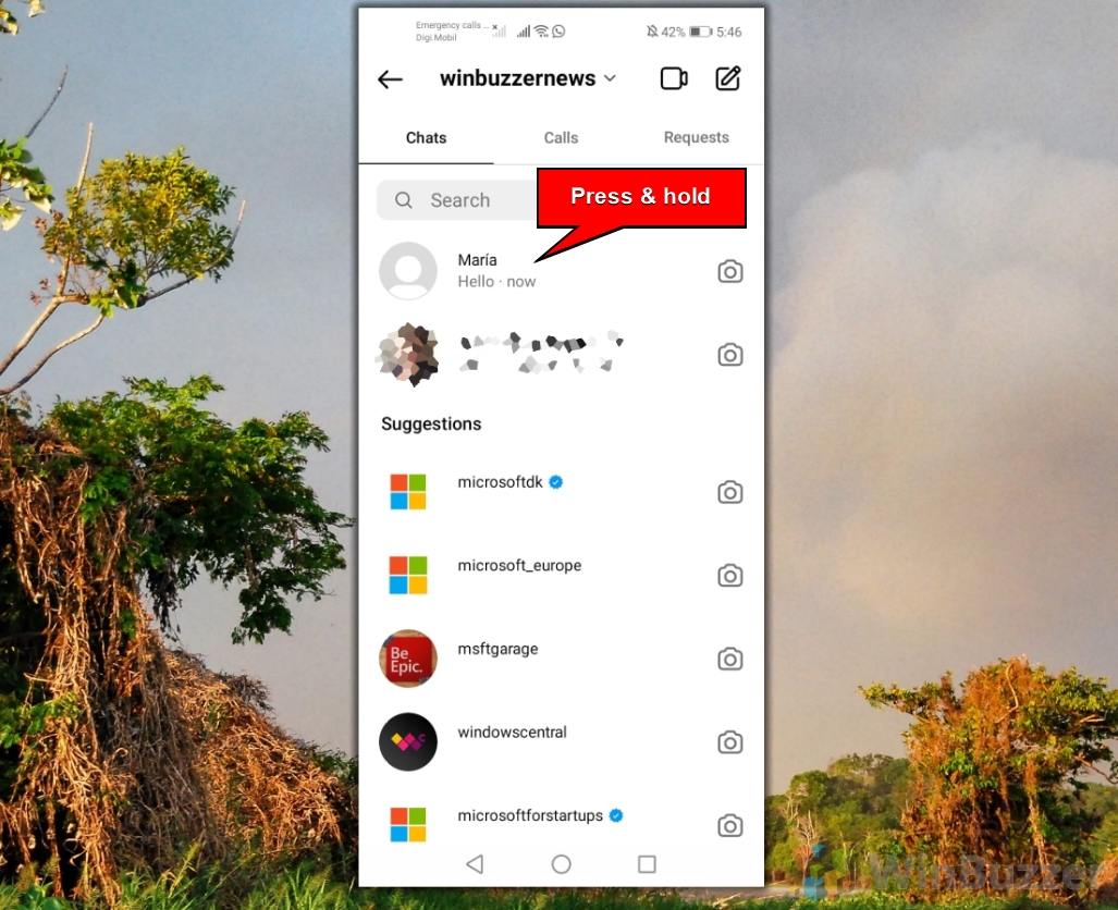 Pressione e segure a mensagem do Instagram que deseja excluir