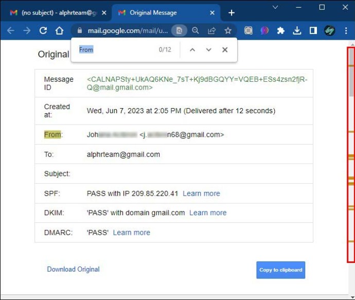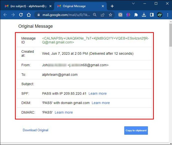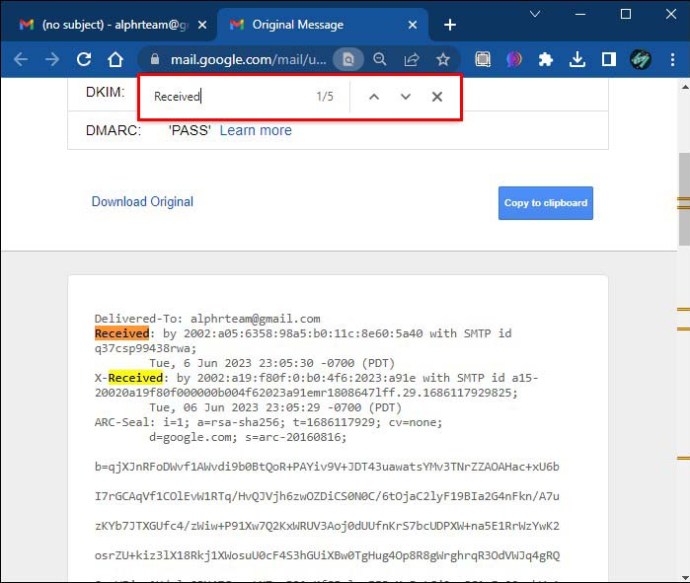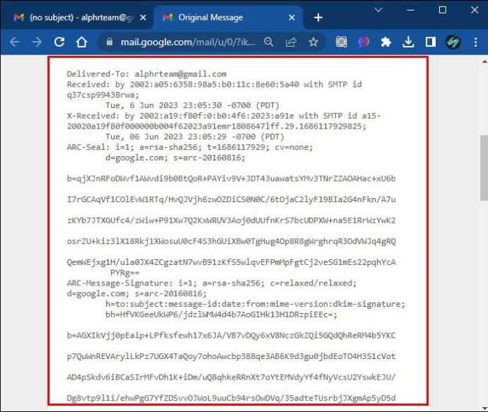 o Escolha o prompt que permite visualizar a mensagem bruta. Agora você verá outra guia que contém o cabeçalho do seu e-mail.