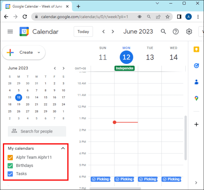 No canto inferior esquerdo, localize “Meus calendários”. Lá você pode ver suas tarefas, lembretes, etc.