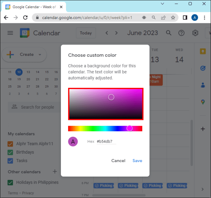 Se você estiver usando o Google Agenda em sua área de trabalho, ao invés de seu telefone, você pode até escolher um tom personalizado de sua cor favorita usando o seletor de gradiente.