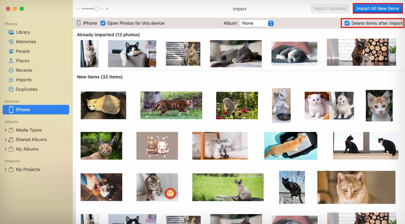 Conecte seu iPhone ao seu computador Mac via cabo Lightning. Abra o aplicativo Fotos no seu Mac. Clique em iPhone na barra lateral esquerda. Certifique-se de marcar a opção Excluir itens após a importação e clique em Importar todos os novos itens.