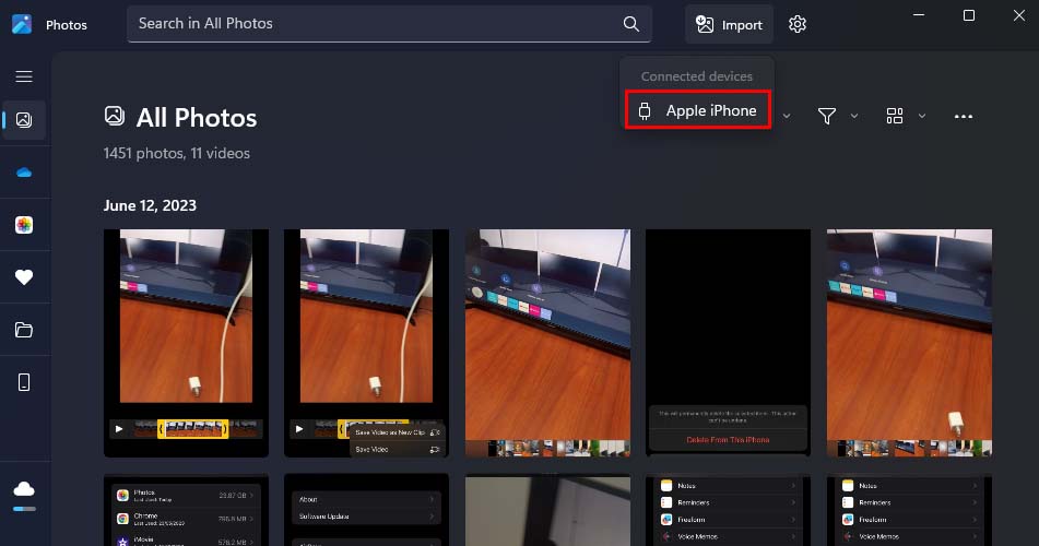 Conecte seu iPhone ao computador com Windows. Abra o aplicativo Fotos em seu PC com Windows. Clique em Importar no canto superior direito e selecione Apple iPhone.