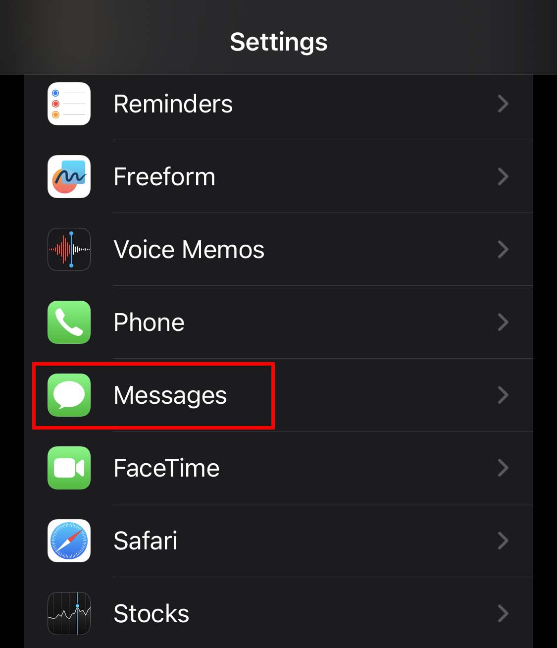 Inicie Configurações. Role para baixo e toque em Mensagens.