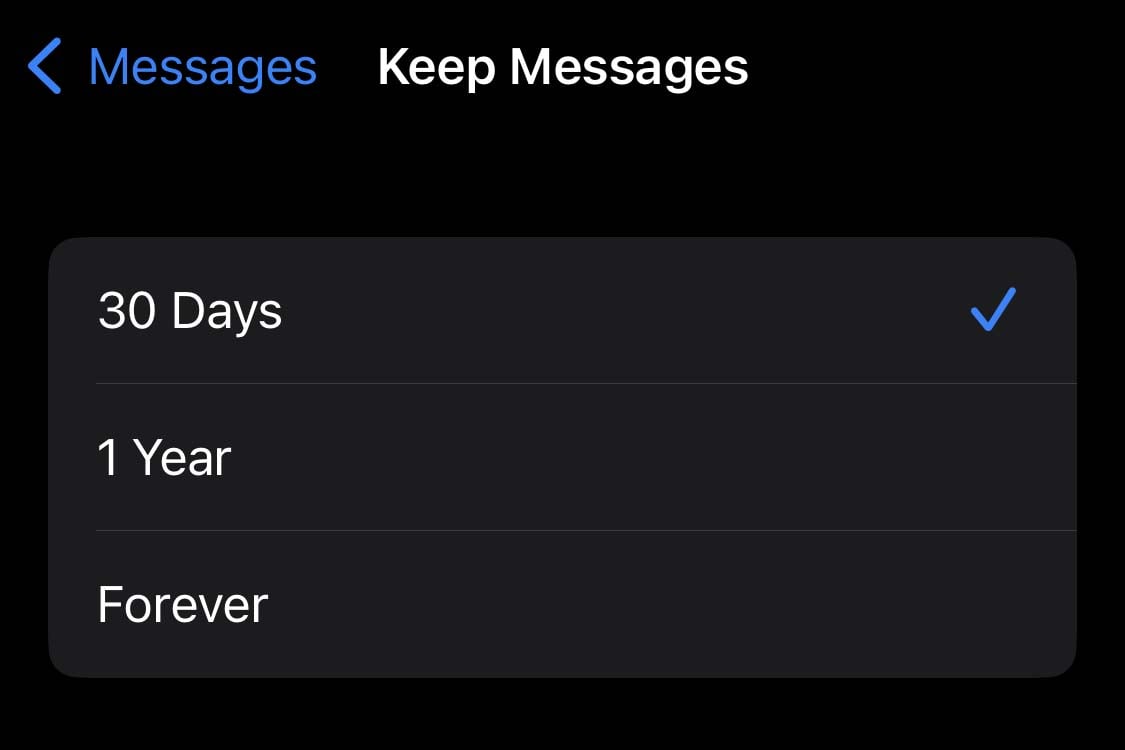 Outra coisa que ocupa seu espaço de armazenamento que você pode não esperar são suas mensagens. Se você definiu suas mensagens para nunca serem excluídas, acumulará gradualmente todas as mensagens de texto, fotos e vídeos enviados e recebidos.