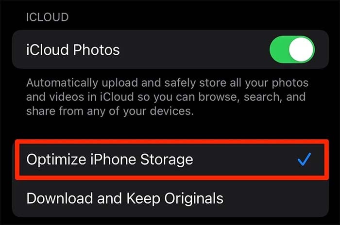 A configuração de armazenamento otimizado do iPhone moverá todas as suas fotos e vídeos de alta resolução para o seu iCloud e manterá cópias da foto do tamanho de um dispositivo em seu iPhone. Isso garantirá que suas fotos e vídeos ocupem muito menos espaço de armazenamento em seu dispositivo.