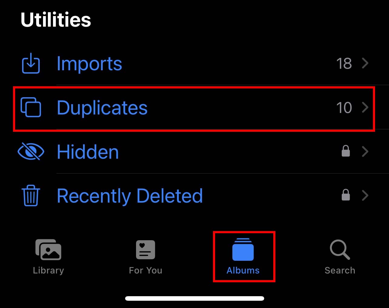 Abra o aplicativo Fotos . Vá para Álbuns e role para baixo até Utilitários.