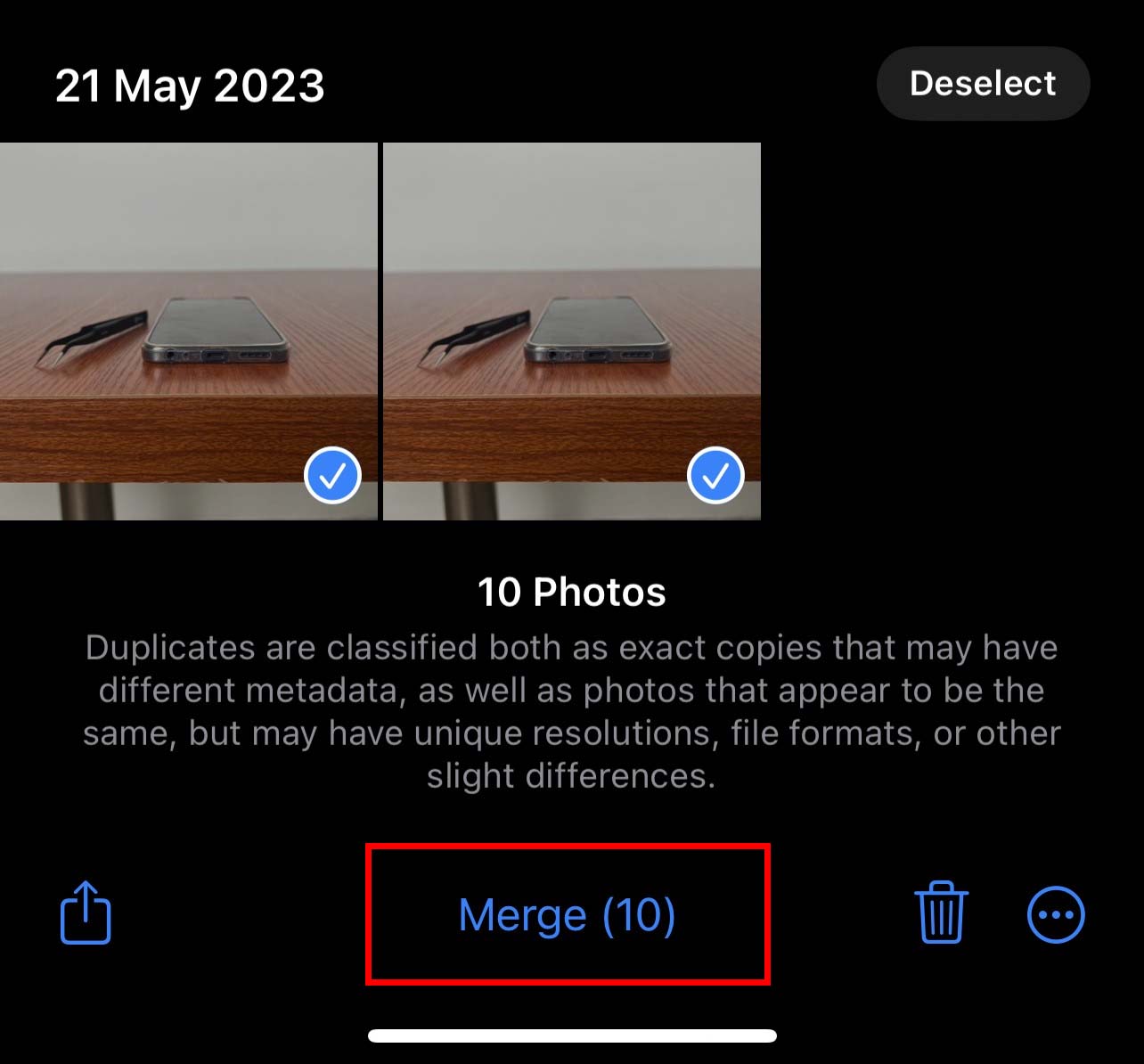 Selecione Duplicates e toque em Selecionar no canto superior direito. Toque em Selecionar tudo e selecione Mesclar na parte inferior.