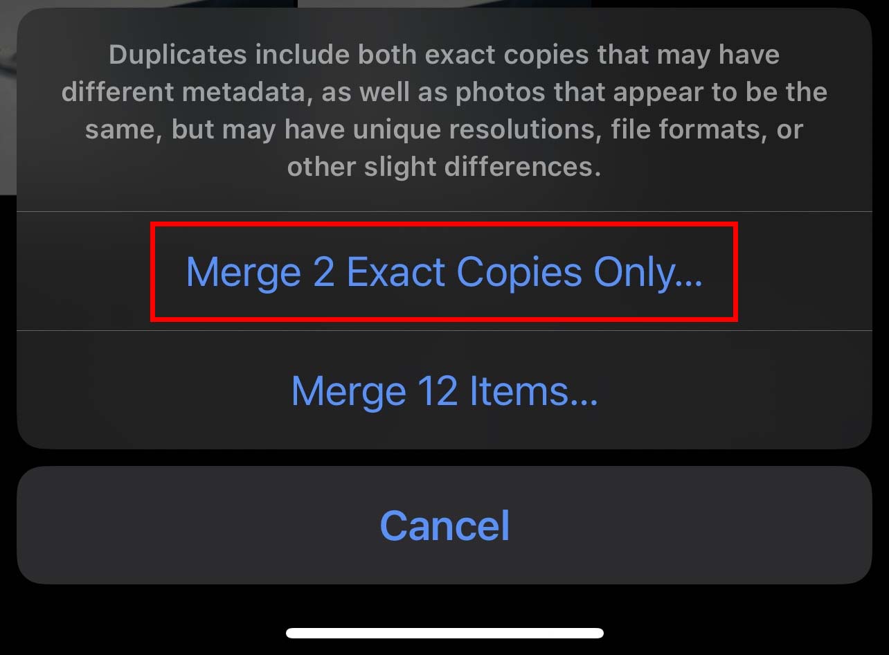 Toque em Mesclar cópias exatas. O resto de suas fotos duplicadas podem diferir ligeiramente. (Você pode selecionar e escolher manualmente quais fotos duplicadas manter e quais excluir.)