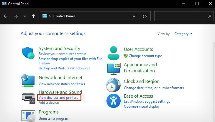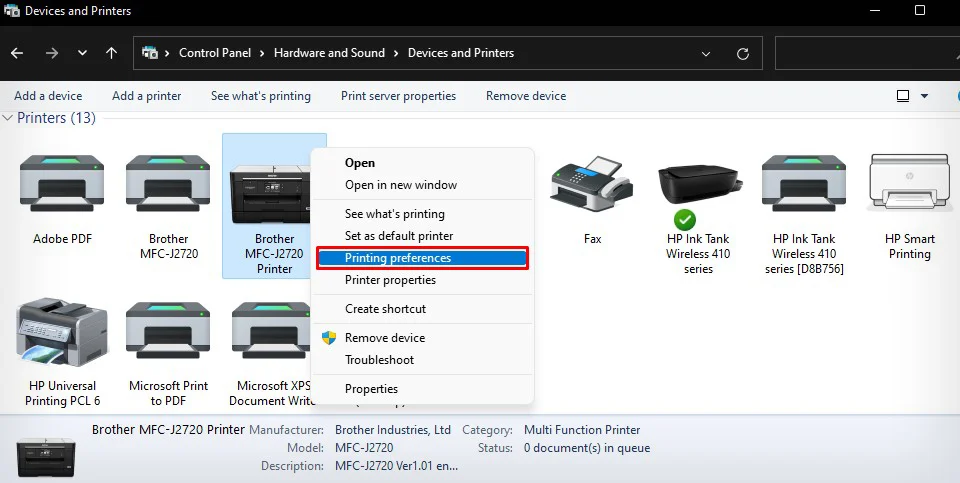 Na janela Dispositivos e impressoras, clique duas vezes em impressora HP.