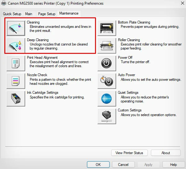 Clique na guia Manutenção na parte superior e escolha Limpeza da cabeça de impressão.