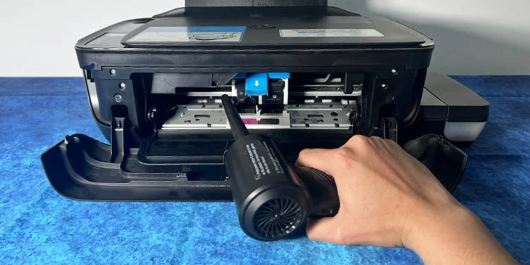 Você pode pegar rapidamente um soprador e limpar o caminho do papel da impressora. Além disso, você também pode comprar folhas de limpeza em uma gráfica próxima e usá-las para limpar o caminho do papel.