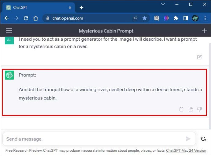 Leia o prompt fornecido pelo bot. Para este exemplo, o ChatGPT disse: “Certamente! Aqui está uma sugestão para uma cabana misteriosa em um rio: em meio à densa floresta, escondida por um véu de névoa, uma cabana solitária emerge nas margens de um rio sinuoso. A cabana está desgastada e desgastada, suas paredes de madeira com as cicatrizes do tempo …”e mais.